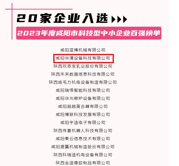 • 2024-02-20熱烈祝賀咸陽華清設備科技有限公司榮獲2023年度咸陽市科技型中小企業榜單
